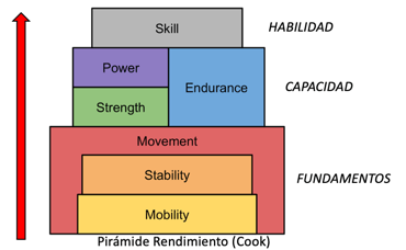 Cook habló de una Piramide de Rendimiento en la que se debe tener unos buenos fundamentos sobre los que se deberá desarrollar la capacidad y finalmente la habilidad especifica deportiva.