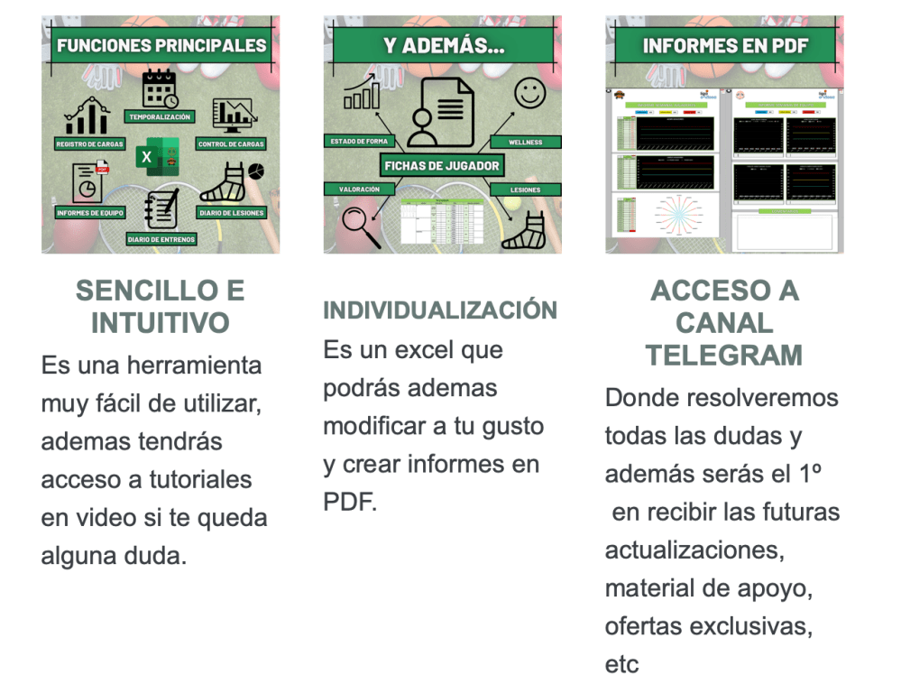 – Control y cuantificación cargas. – Registro e informe de lesiones. – Valoración e informe de jugadores. – Diario de entrenamientos – Válido para 24 Jugadores.