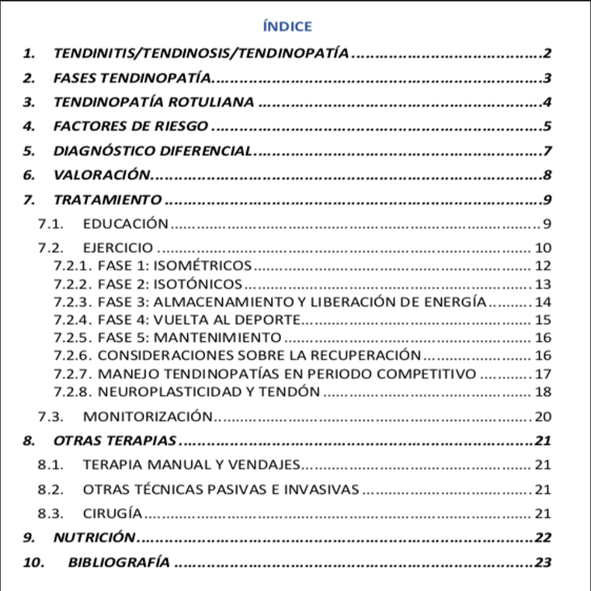 Documento dirigido a profesionales del deporte (fisioterapeutas, entrenadores, readaptadores, estudiantes, medicos, etc) que busquen conocer todo lo relacionado con la tendinopatía rotuliana.